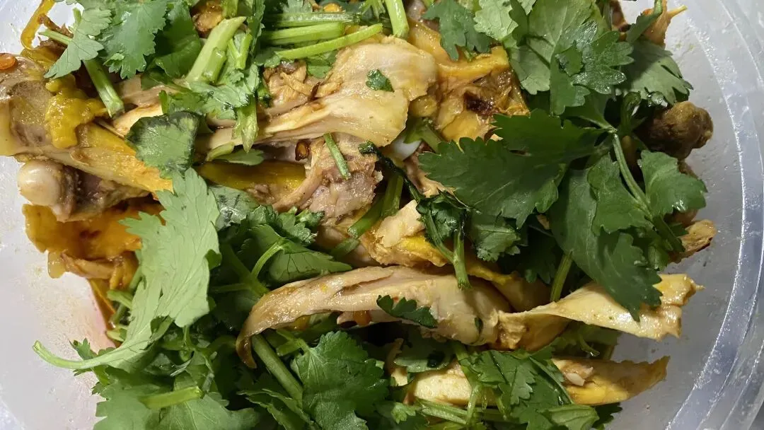上车就开吃,捆鸡味道不错,据说是猪小肠做的,还加了腐竹,不咸不淡,可以空口吃。荷香鸡味道要平淡些,不突出,鸡肉肉质一般,现在对拌鸡要求比较高,红油不香肉质不好的吃不下去……