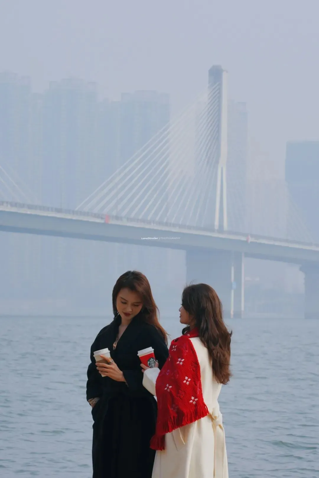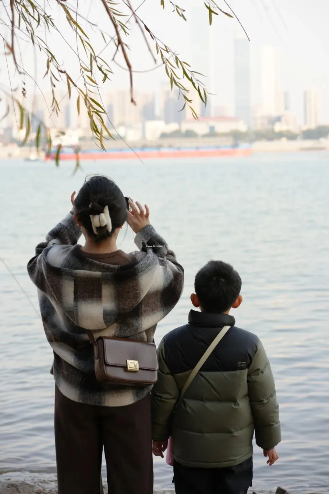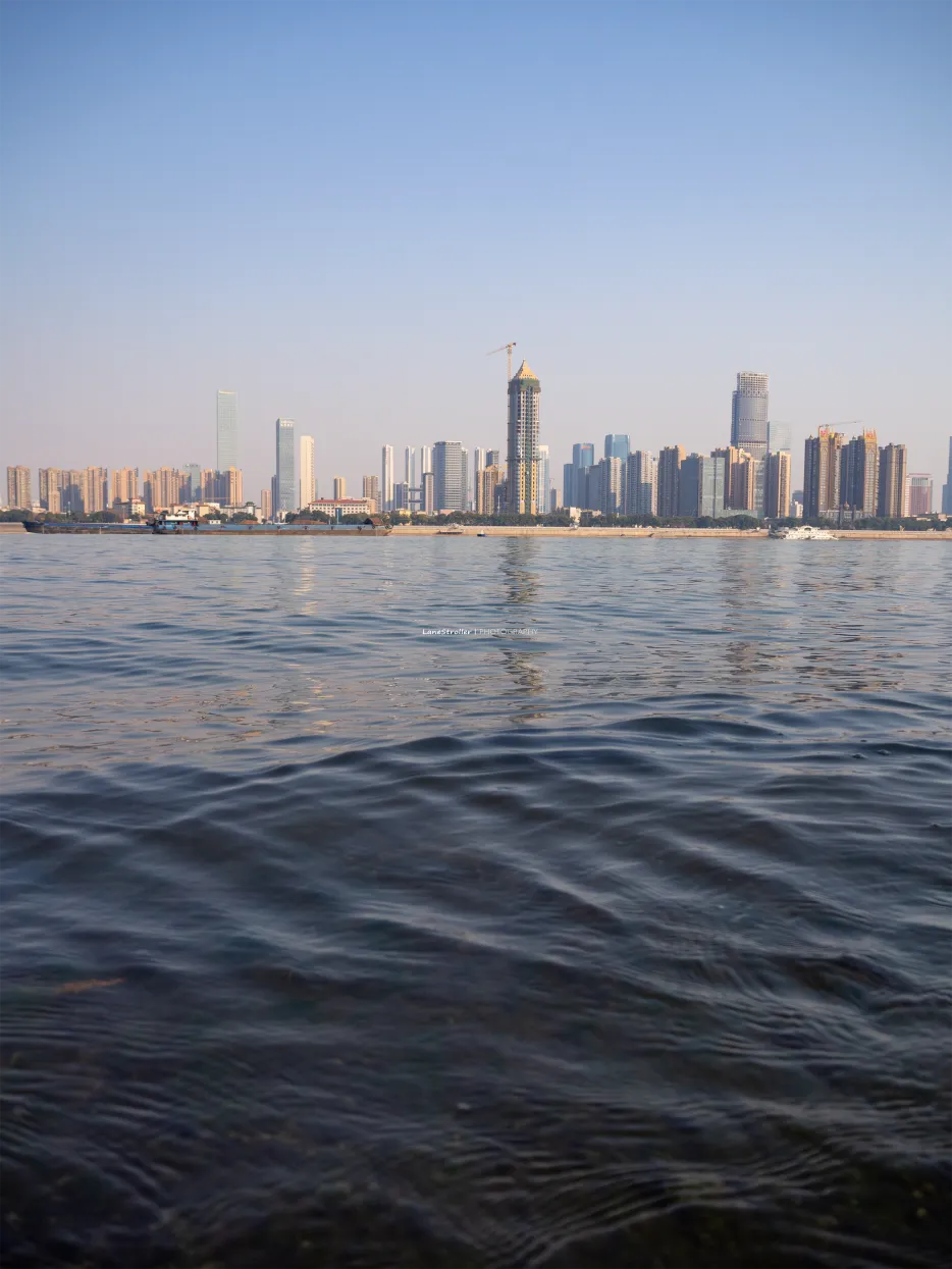 对岸高楼在雾中若隐若现,江面宽阔得令人惊讶