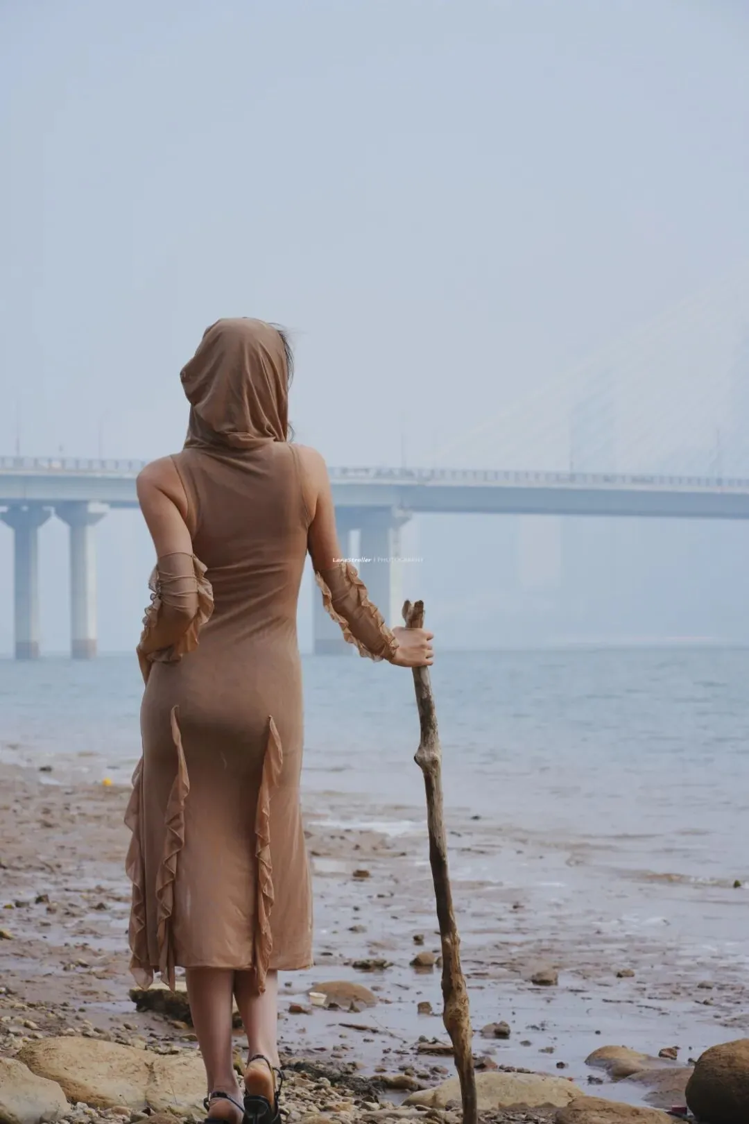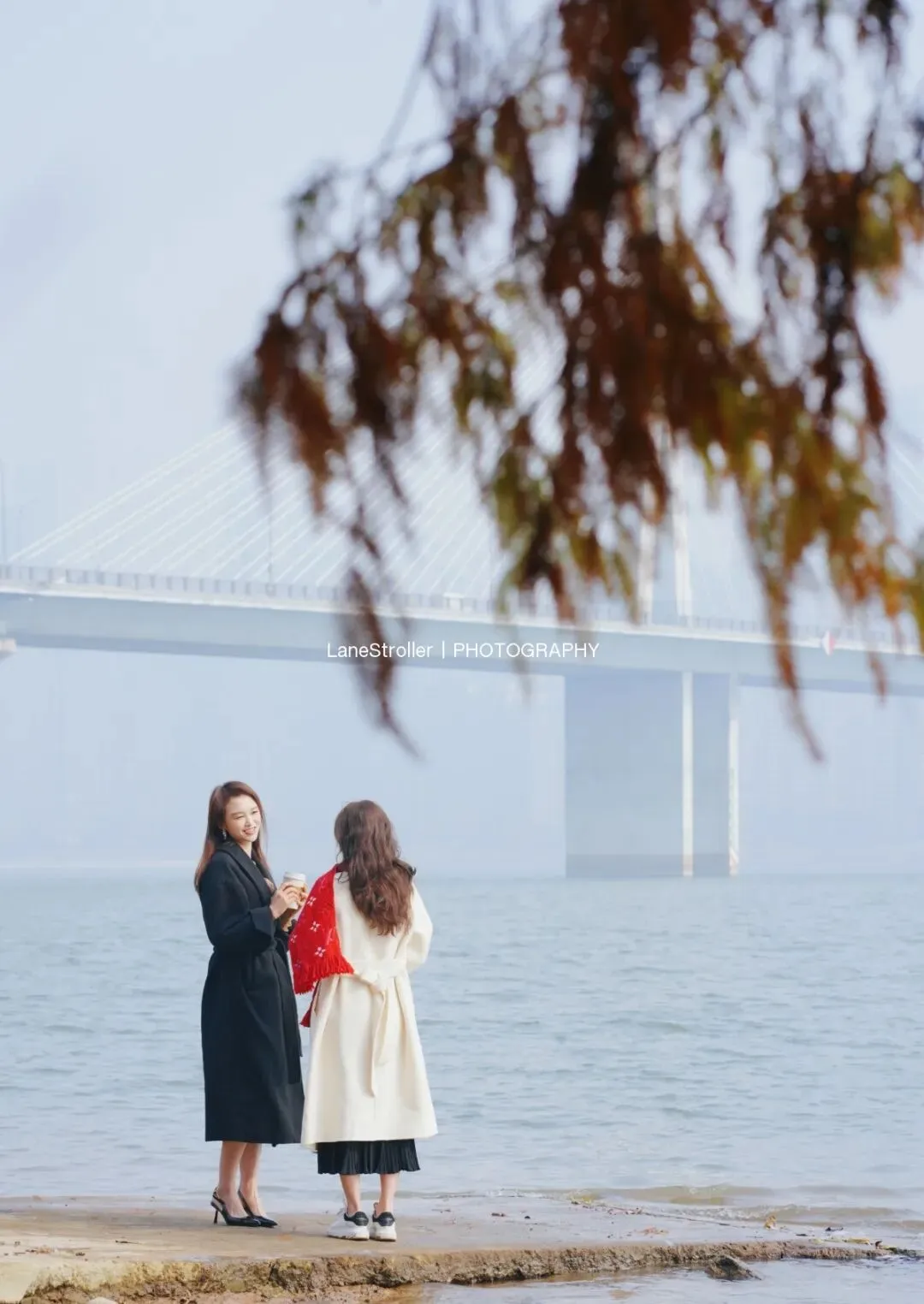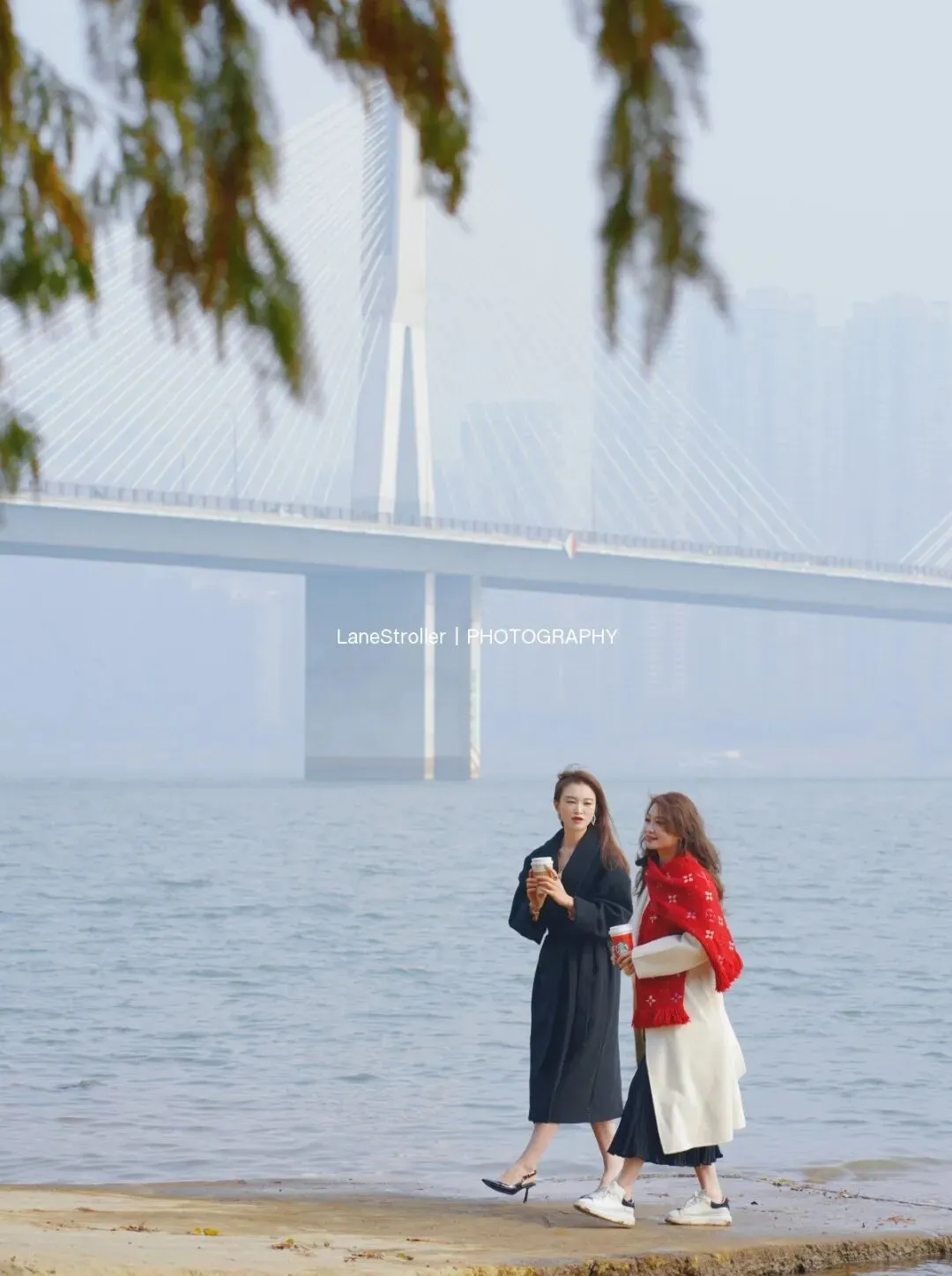 对岸高楼在雾中若隐若现,江面宽阔得令人惊讶