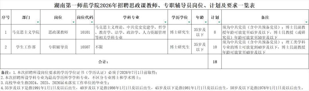 1.湖南第一师范学院2026年招聘思政课教师、专职辅导员岗位、计划及要求一览表.xls