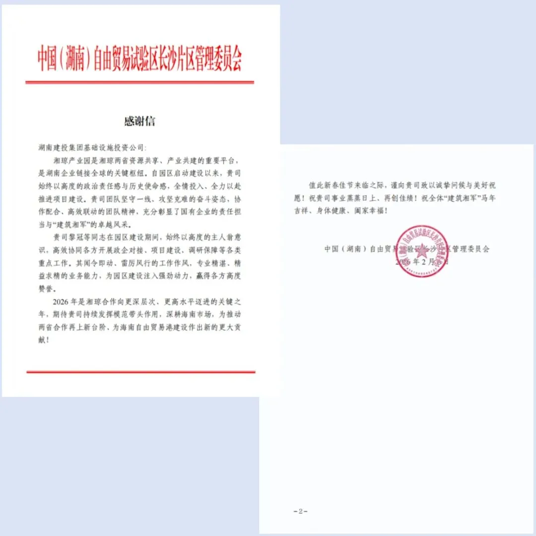 湘琼产业投资公司表示,将以此次感谢信为新起点,传承弘扬 “建筑湘军” 优良传统,锚定园区远期千亿产值目标,全速推进一期配套工程建设,持续深化湘琼产业协同与开放合作,以更高标准、更实举措服务海南自贸港建设大局,以国企作为书写跨省区域合作新篇章。