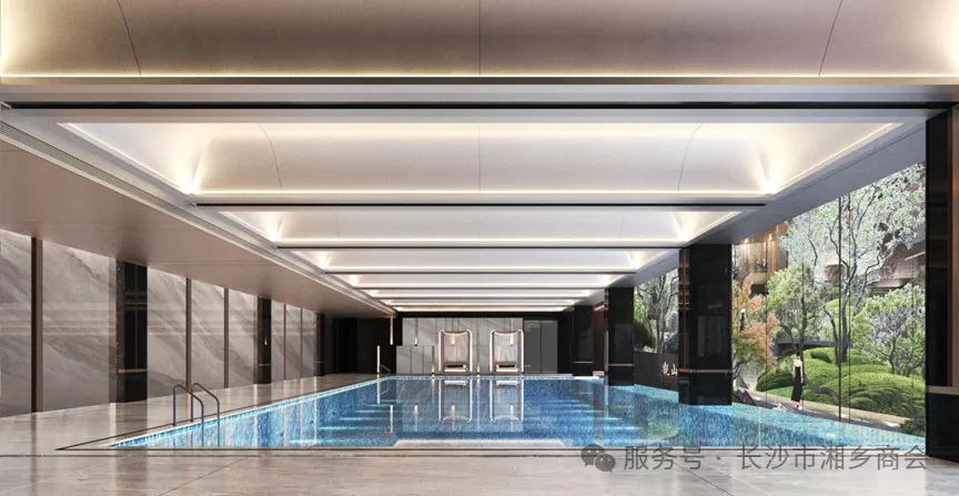恒温泳池:特设标准级恒温游泳池,全落地窗对望中心园景,畅泳之间尽享山水园林诗景盛境。