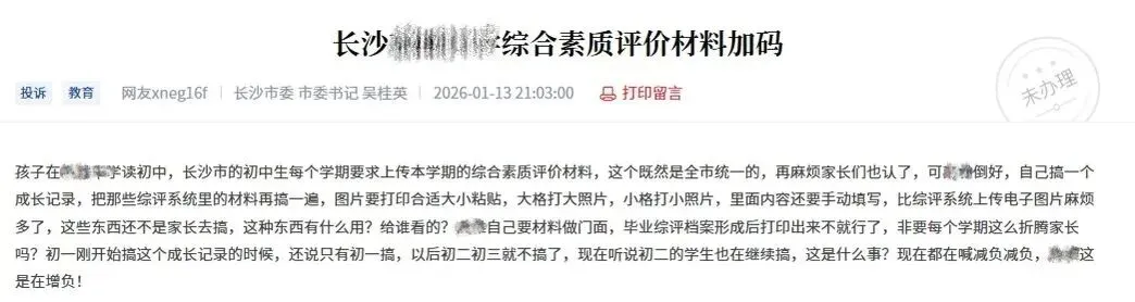 综合素质评价是以学生初中三年在校日常表现为依据,以班级为单位,通过学生互评和教师评价相结合的方法,来确定学生综合素质评价各维度最终评定结果。近日,某中学家长反映学校综合素质评价材料加码,违背减负宗旨。有家长在问政湖南上留言:“长沙市的初中生每个学期都要求上传本学期的综合素质评价材料。但是学校却另外有自己的成长手册,需要把综评系统里的材料重新弄一遍,比综评系统更加麻烦。”家长认为这一规定有违减负,给学生和家长都来了额外负担。