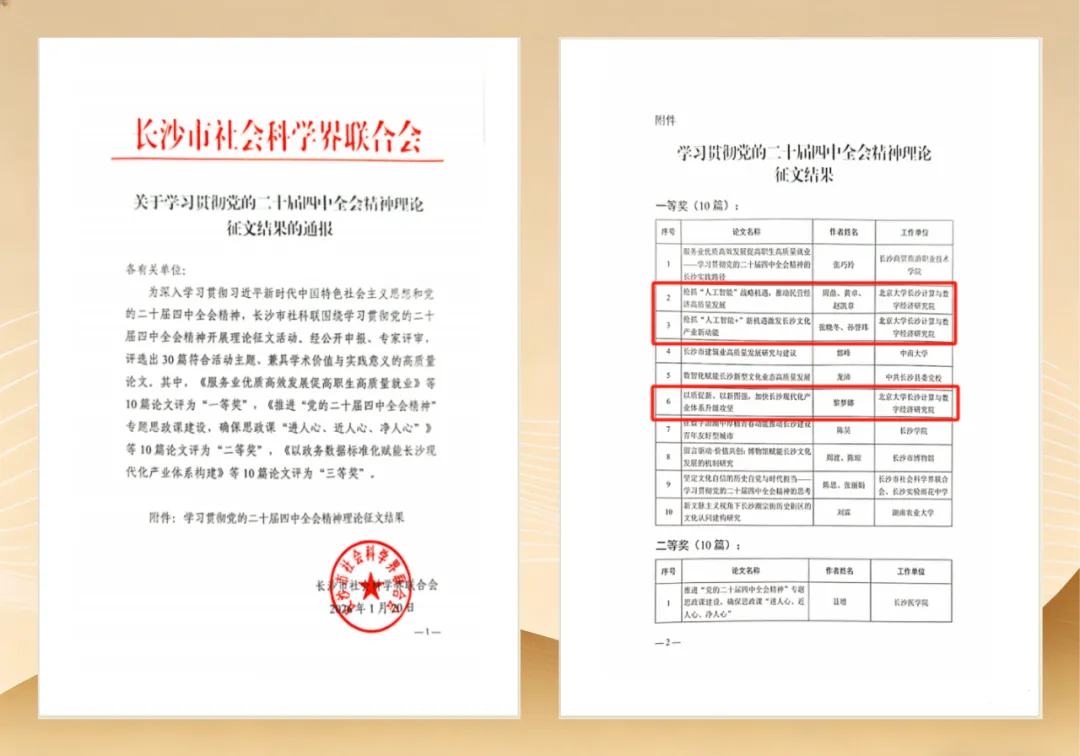 研究院三项研究成果获长沙市学习贯彻党的二十届四中全会精神理论征文一等奖