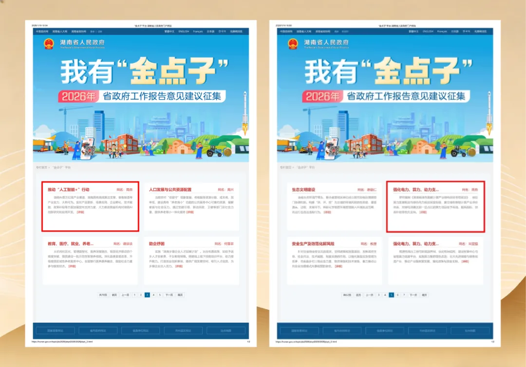2月2日,湖南省“我有‘金点子’——2026年省政府工作报告意见建议征集”活动收官,研究院数字经济与科技创新智库主任助理、助理研究员周鼎提出的两条“金点子”在湖南省政府门户网站“上墙”展示,为湖南省新一年度发展建言献智。其中,《以算电协同为绿色智能计算产业提质增效》提出,研究编制《湖南省绿色智能计算产业绿电供给专项规划》,建立绿色智能计算产业评价体系,对绿电消费达到一定占比的算力项目给予财政补贴等优先支持。《做优湖南“端侧AI”创新赛道》提出,宜在产品更新、场景应用、企业孵化、技术赋能、政策补贴等方面加大定向支持力度,大力推进我省机构开展端侧AI创新研究和应用开发。