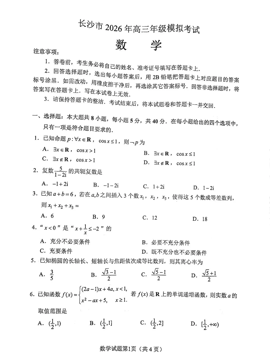 >长沙市2026年高三适应性考试 数学试卷