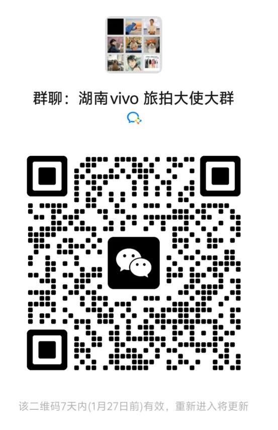 1.采用 “大群发布 + 小群服务” 模式,确保每位旅拍大使清晰了解规则、获得实时协助(扫码加入湖南 vivo 旅拍大使大群,二维码 7 天内有效,1 月 27 日前可扫码进入)。
