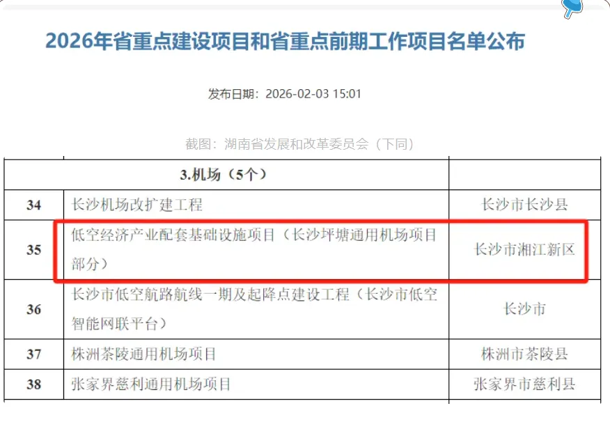 近期,湖南省发改委正式公布2026年度省重点建设项目名单,低空经济产业配套基础设施项目(长沙坪塘通用机场项目部分) 位列第35项,长沙低空经济发展再添重磅支撑。