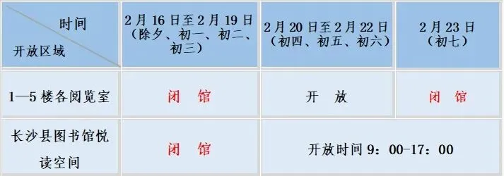 2月24日起,各场馆恢复正常开放。其中,长沙县图书馆开放时间为9:00-17:00(周一闭馆),一楼悦读空间开放时间为9:00-21:00。