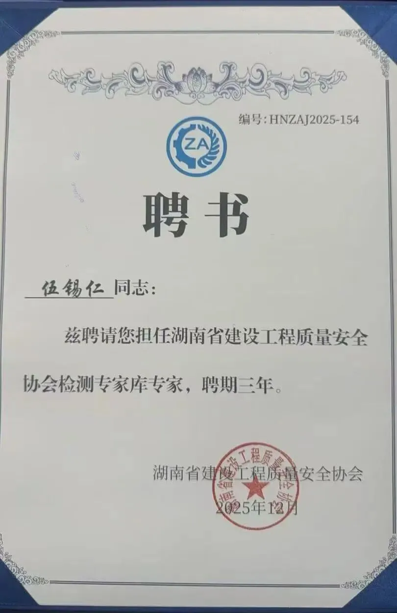 近日,本会副会长、湖南中科工程检测有限公司董事长伍锡仁被湖南省建设工程质量安全协会聘请为湖南省建设工程质量安全协会检测专家库专家,聘期三年。