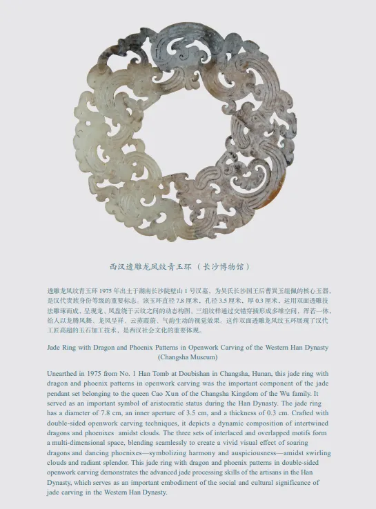 这件1975年出土于长沙市湖陡壁山一号墓的双面透雕龙凤纹青玉环,不仅代表西汉精湛的玉器工艺,更深刻反映了西汉时期的社会文化风貌,是长沙国这一辉煌历史的重要见证者。