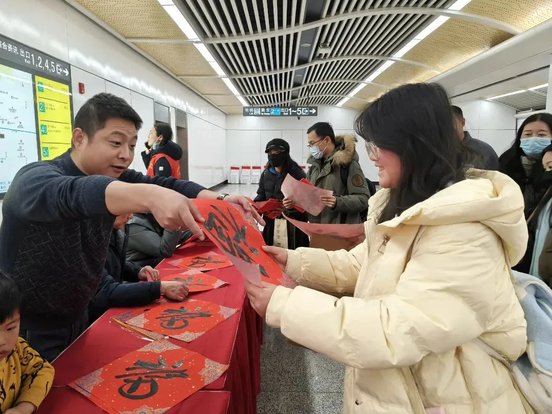 活动现场气氛热烈。在创作互动区,纸本艺术馆特邀的书法家们挥毫泼墨,市民与游客有序排队,纷纷挑选心仪的联句,等待书法家现场书写。“手写的春联才有年味,没想到在地铁站就能领到这么有意义的新春礼物,既实用又暖心!”一位领取到春联的市民开心地说道。两个半小时里,书法家们根据市民需求创作了数百副春联和“福”字,将新春祝福融入墨香,温暖了市民的出行路。