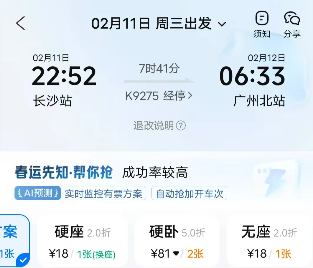 我在平台查询了下2月11日的票务,发现还挺抢手,刚刚查询的时候,只剩下一张硬座票了,票价81元的硬卧仅剩2张,无座票也只有1张。