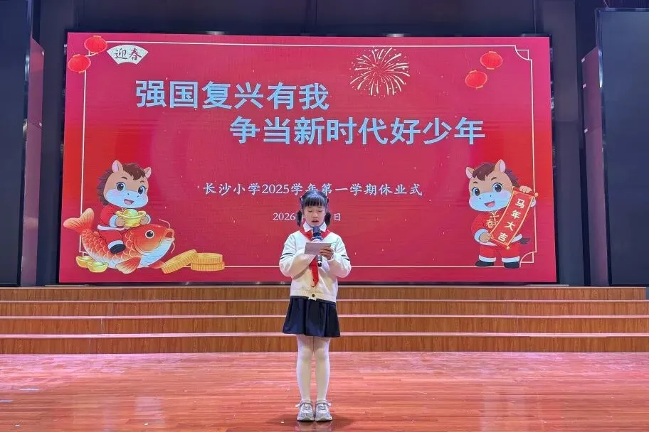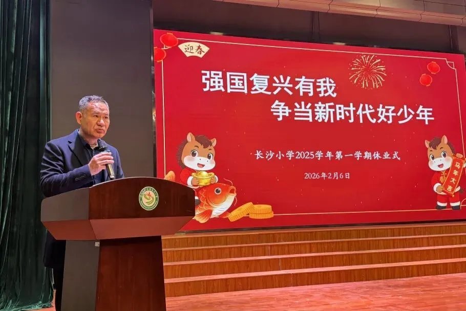 春华秋实,岁序更迭。在充满收获与希望的一学期即将落下帷幕之际,长沙小学于2026年2月6日上午8:30在学校风雨操场隆重举行了主题为“强国复兴有我,争当新时代好少年”的2025学年第一学期休业式。全体师生齐聚一堂,共同回望奋进足迹,表彰先进典范,展望美好假期。