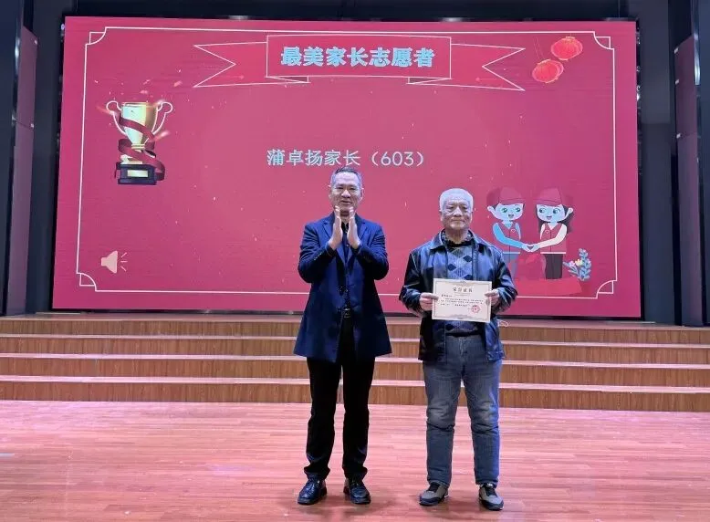 接下来,罗校颁发最美家长志愿者,特别感谢了603班蒲卓扬家长对学校工作的无私奉献与大力支持。