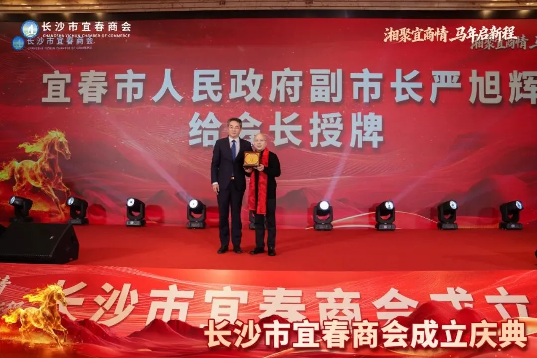 宜春市人民政府副市长严旭辉,给长沙市宜春商会会长甘涛授牌。