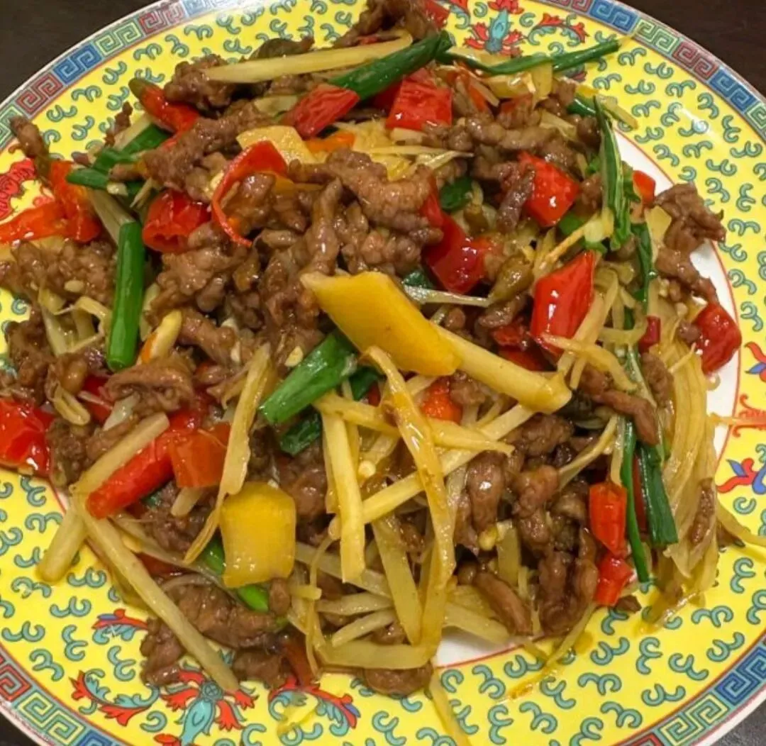 牛肉切得薄而不碎,嫩而不柴,裹着亮红的酱汁,香而不腥;子姜细如发丝,和肉丝缠在一起,挑都挑不干净,却越嚼越香,辛香不冲、鲜辣入味,妥妥的下饭神器。
