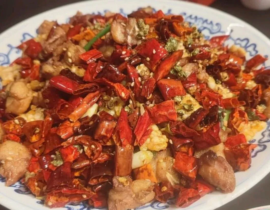 鸡肉切丁均匀,先炸锁汁,再与二荆条、花椒猛火爆炒,色泽红亮、香气霸道。入口外酥里嫩,麻、辣、香、酥层层递进,在辣椒堆里“寻宝”式夹肉,越吃越上头。
