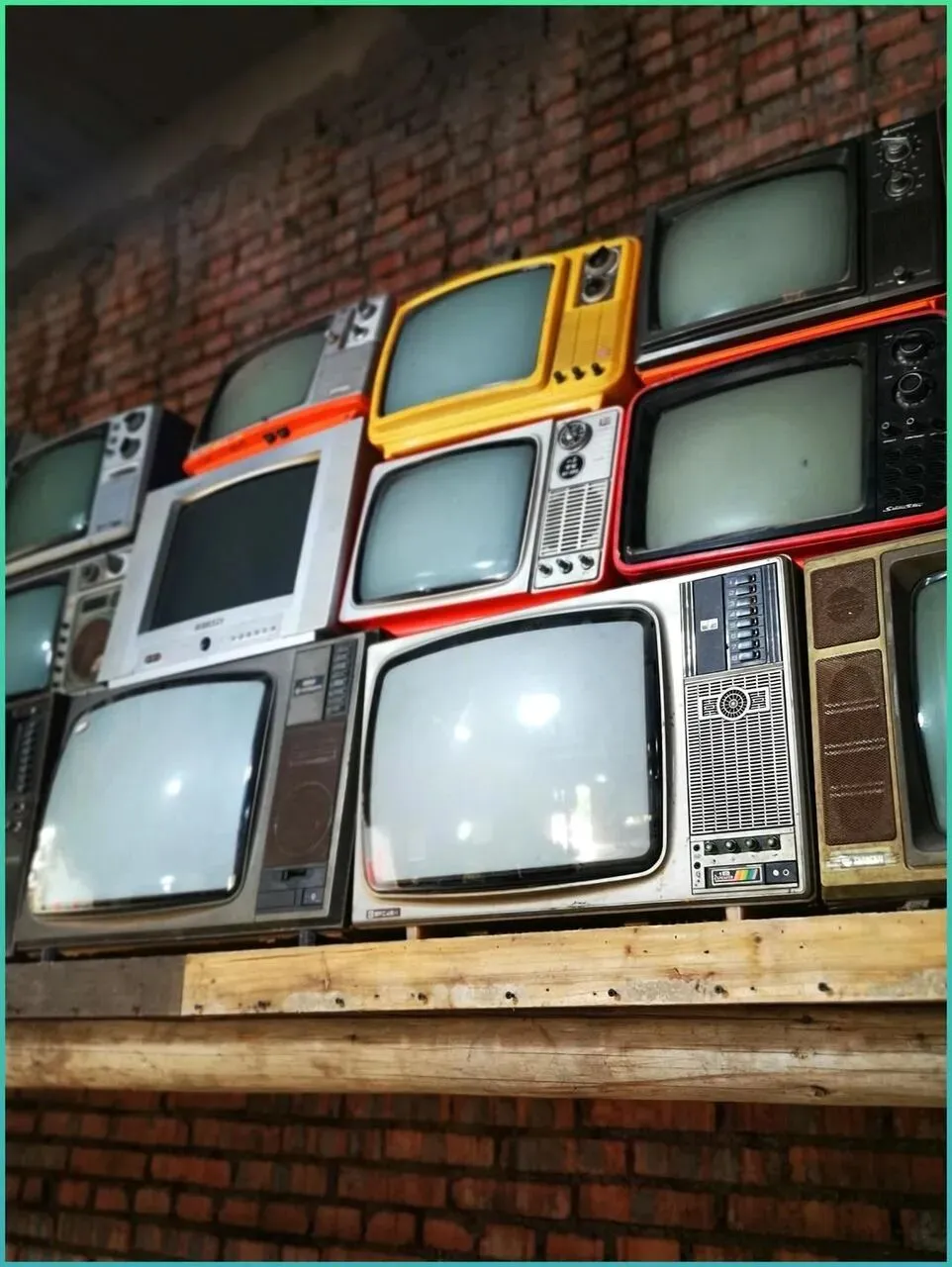 天哪,这一墙的电视机.,简.直是童年记忆博物馆.! 黄的,红的,黑的,各种颜色.各种款式.,每一台后.面都是一个家庭围坐在一起的温馨画面。