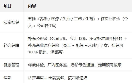 福利政策因岗位(生产 / 技术 / 职能)、城市、司龄略有差异,以上为中国区通用核心内容。