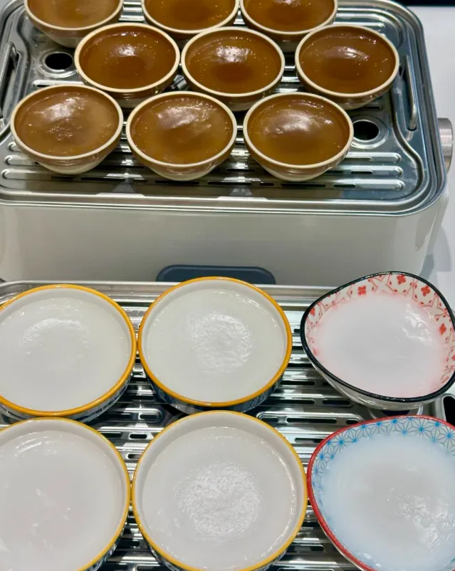 这小东西长得像个小磨盘,只有巴掌大。做法看着简单,其实讲究。用上好的粘米粉和糯米粉按比例兑好,加上红糖水,倒进特制的陶土小杯子里,上笼屉蒸。出锅时,糕体晶莹剔透,中间微微凹陷。咬一口,不是那种软塌塌的口感,而是带着一股子韧劲,Q弹粘牙,红糖的甜味在嘴里慢慢化开,不腻,刚刚好。