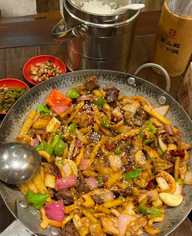 一定要试的是“三下锅”。这菜听着像火锅,其实更像干锅。不是那种汤汤水水的寡淡,而是把肥肠、猪肚、牛肚或者是腊肉,切成大块,下了重油重辣,在铁锅里滋啦滋啦地煸炒。端上来的时候,锅底还冒着小火,油光红亮的,咬一口,外皮焦脆,里面又韧又劲道,辣味顺着喉咙往下钻,一瞬间,汗就出来了,人也就醒了。
