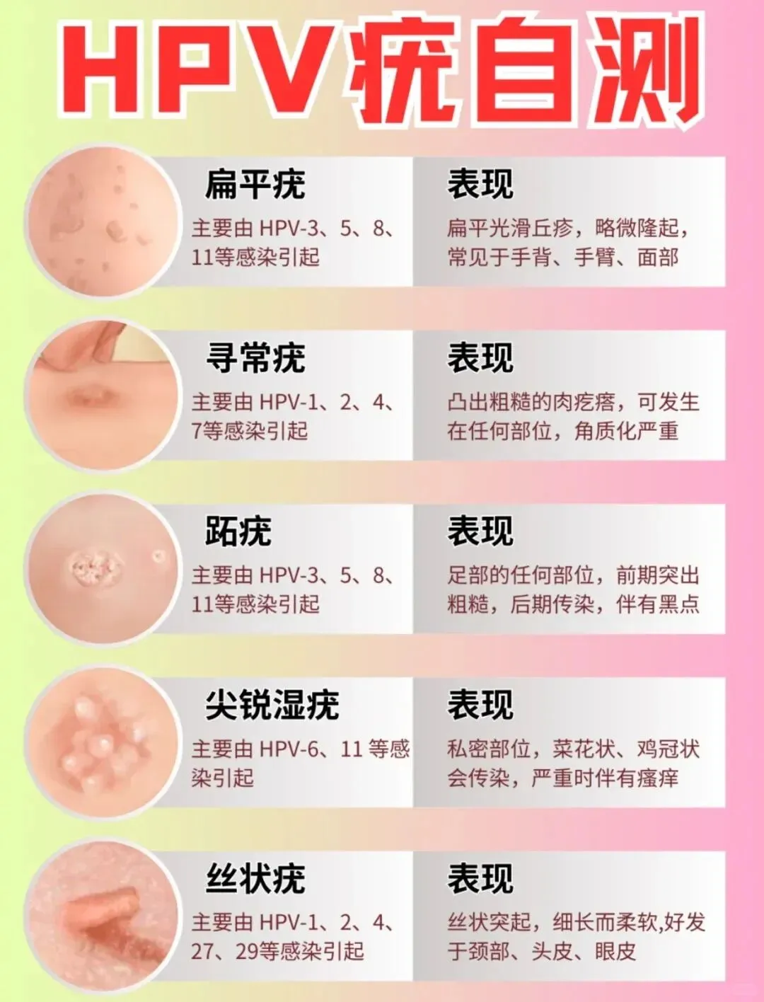 丝状疣、乳头状、鸡冠状或菜花状
