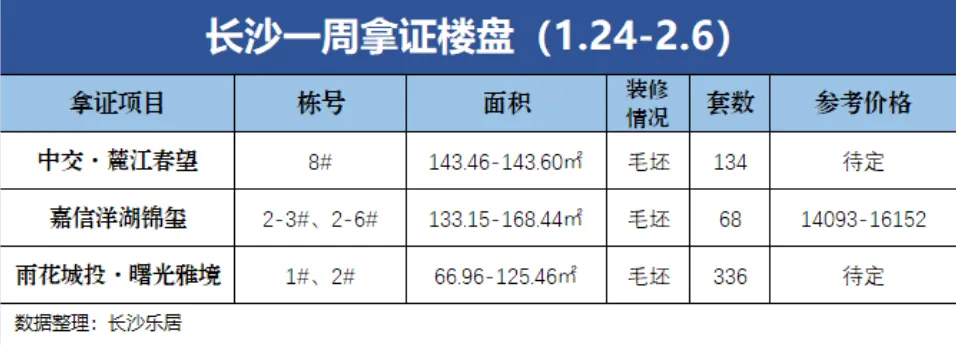 - 嘉信洋湖锦玺(岳麓区)同样获2张证,推出133.15-168.44㎡毛坯房源,新增68套改善型住宅;