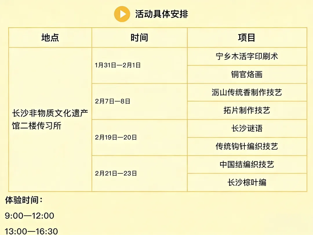 亮点:从农历腊月至正月,围绕春节民俗与生肖马元素,本周末邀请宁乡木活字印刷术、铜官烙画等非遗项目,推出互动性强、年味浓郁的非遗互动与体验。