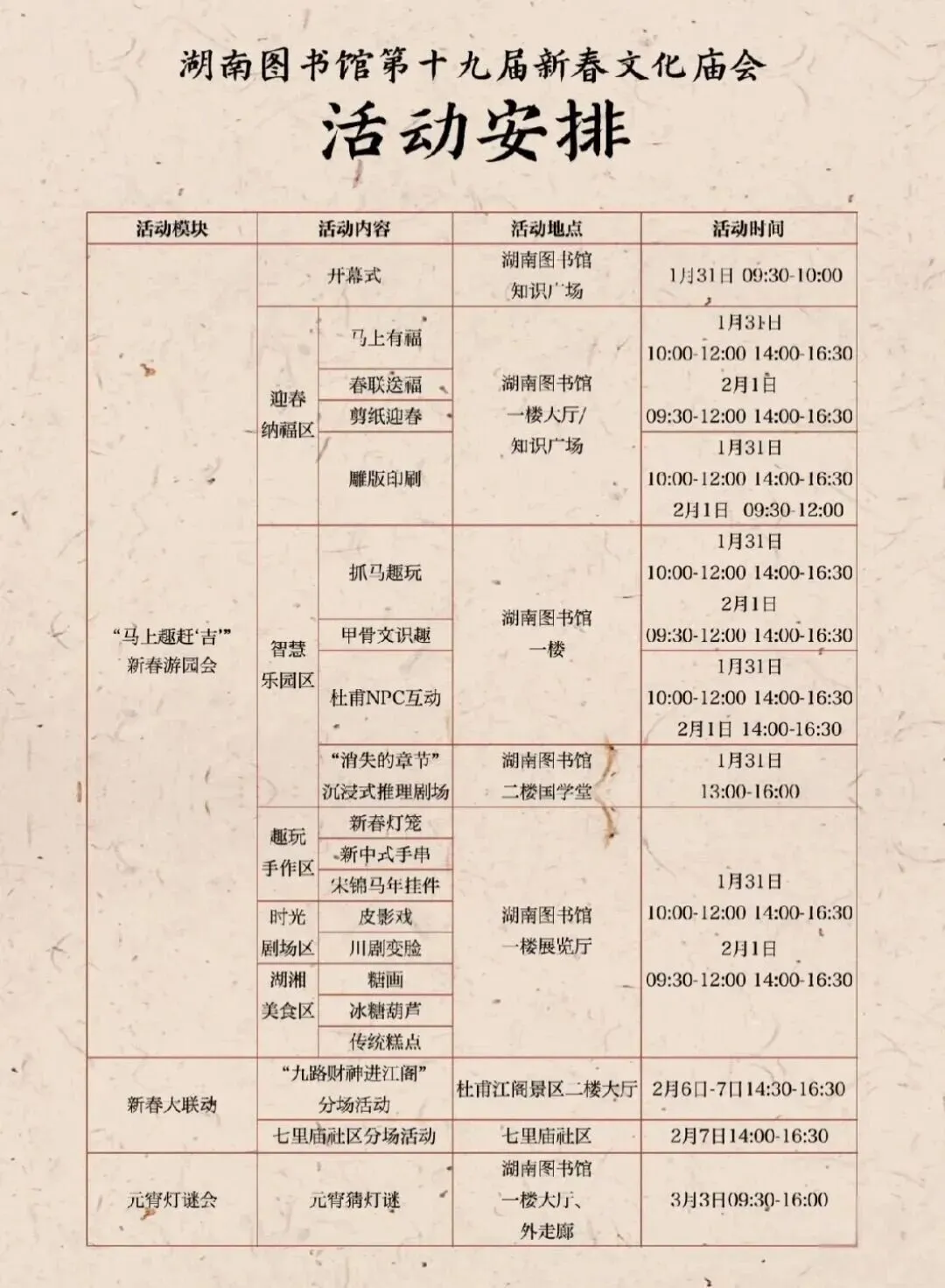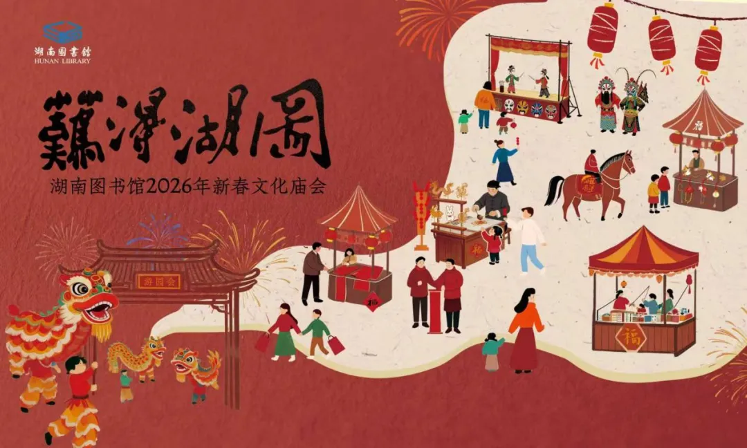 亮点:2026年新春文化庙会以湖南图书馆“难得湖图”IP为核心,突破场馆界限,携手杜甫江阁、七里庙社区等单位,打造“图书馆+文旅+社区”多元融合的活动模式。活动将古籍元素、民俗资源数字化互动、NPC挑战、剧本杀及“集五福”等热门IP相结合,通过“沉浸式+互动式”的体验方式,传播民俗文化、传统技艺与馆藏特色。