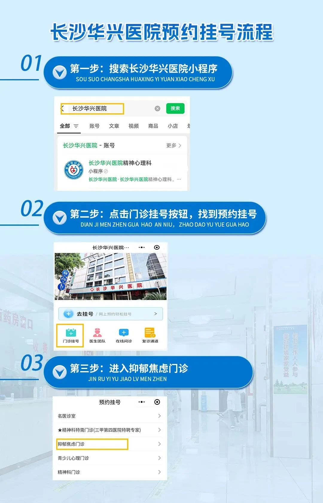 网络预约:关注“长沙华兴医院精神心理科”微信公众号→首页的“预约挂号”