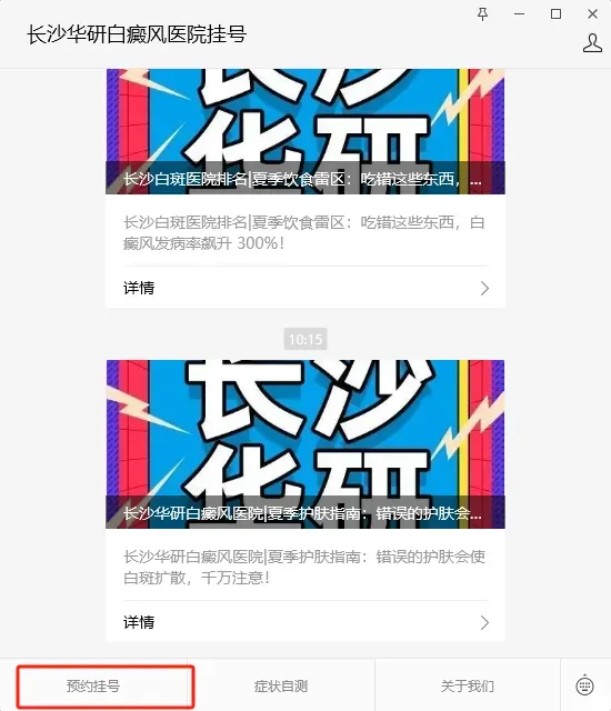 点击关注“长沙华研白癜风医院挂号”微信公众号,并且点击菜单栏中的“预约挂号”进入挂号页面。