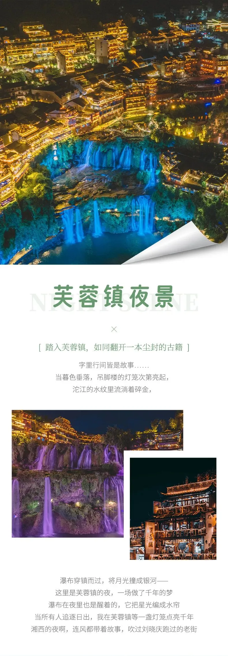 晚餐后可夜游芙蓉镇,看瀑布穿镇而过、吊脚楼灯火璀璨,漫步青石板老街,品尝米豆腐、蒿子粑粑等湘西特色小吃,沉浸式体验千年古镇的烟火气息。