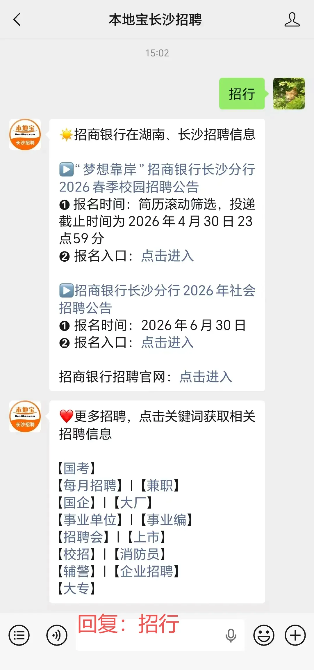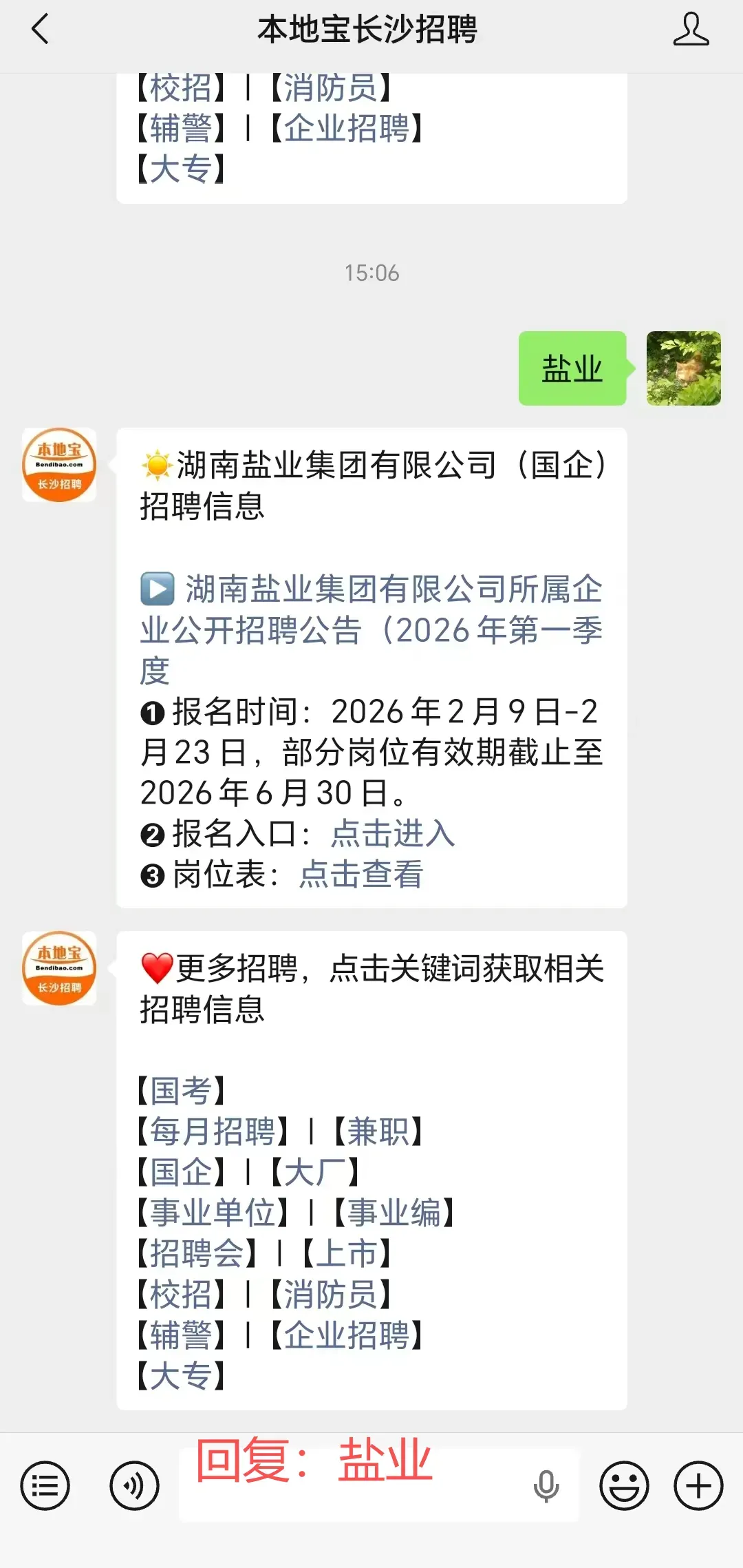 关注【本地宝长沙招聘】,在对话聊天框