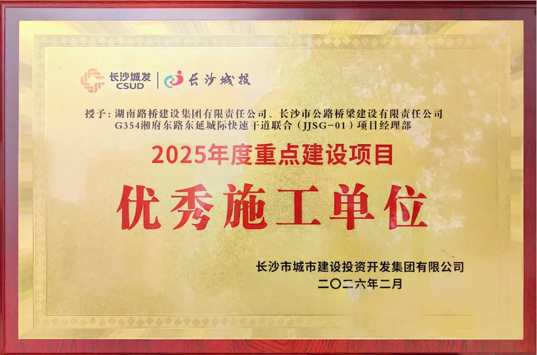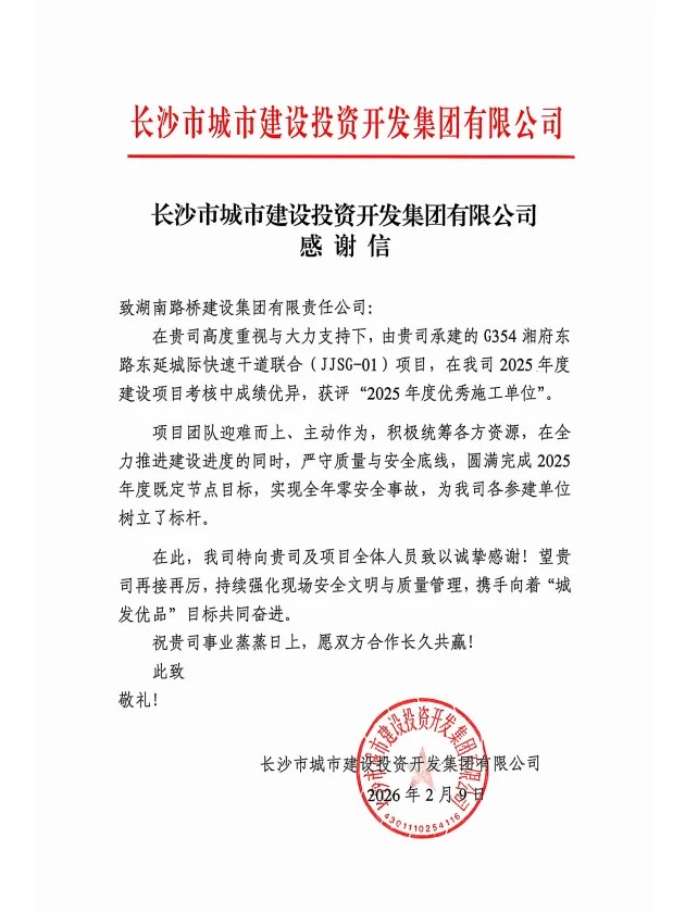 近日,G354湘府东路东延项目获评长沙市城市建设投资开发集团有限公司(以下简称:长沙城投)“2025年度重点建设项目优秀施工单位”称号,项目负责人同步获评“优秀个人”。长沙城投还专门发来感谢信,对项目建设成效给予充分肯定,项目实现团队与个人荣誉双丰收。