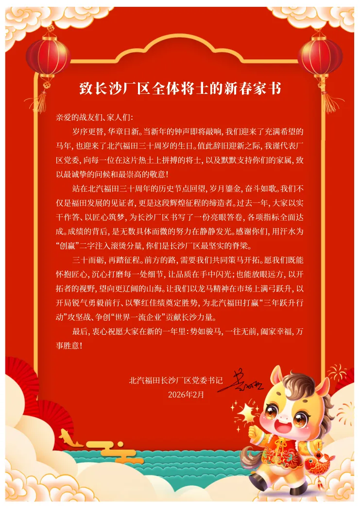 愿这份温暖伴大家共度团圆美满的新春佳节!新的一年,北汽福田长沙厂区全体同仁将继续并肩前行、聚力奋进,以实干笃行争创“世界一流企业”,携手共赴新征程!