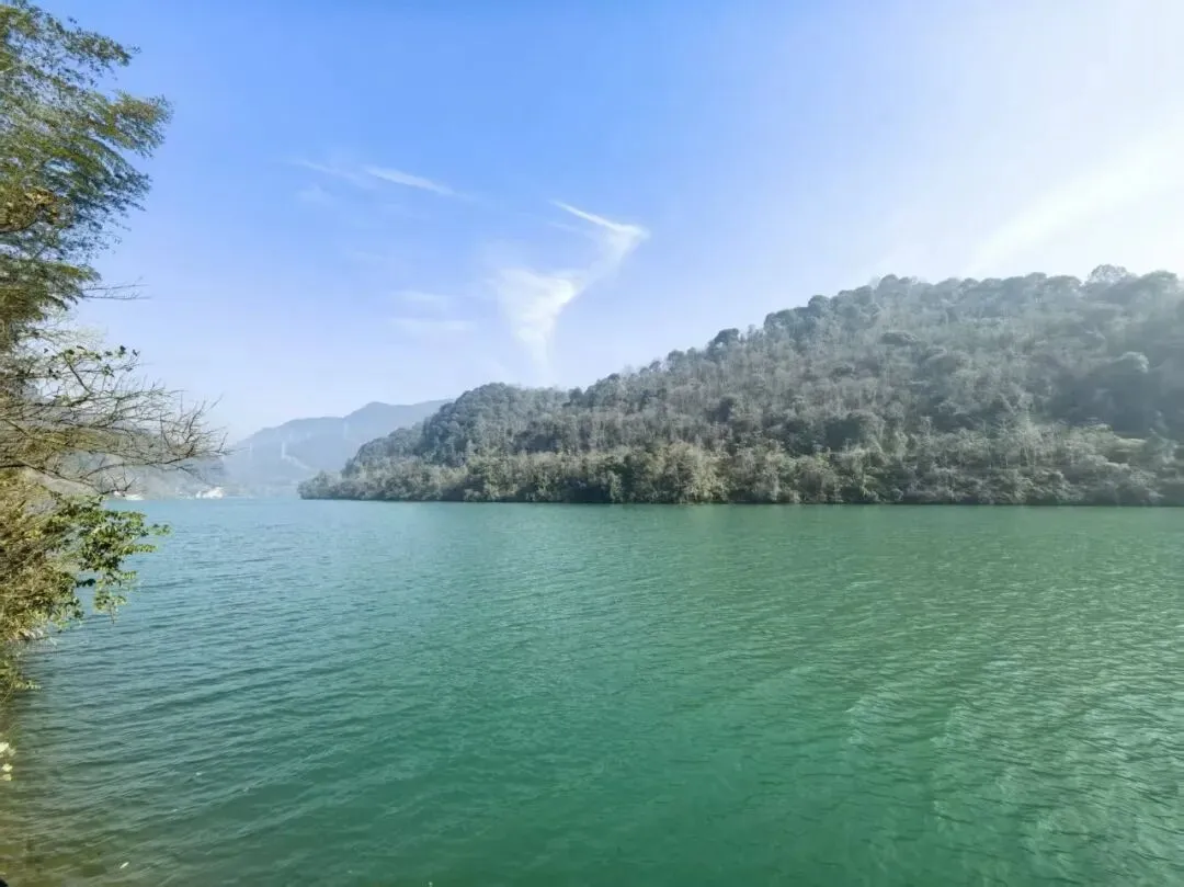 乘坐景区大巴深入湖区,虽无薄雾缭绕,但澄澈见底的湖水、层叠起伏的远山,依然让人眼前一亮,心旷神怡。