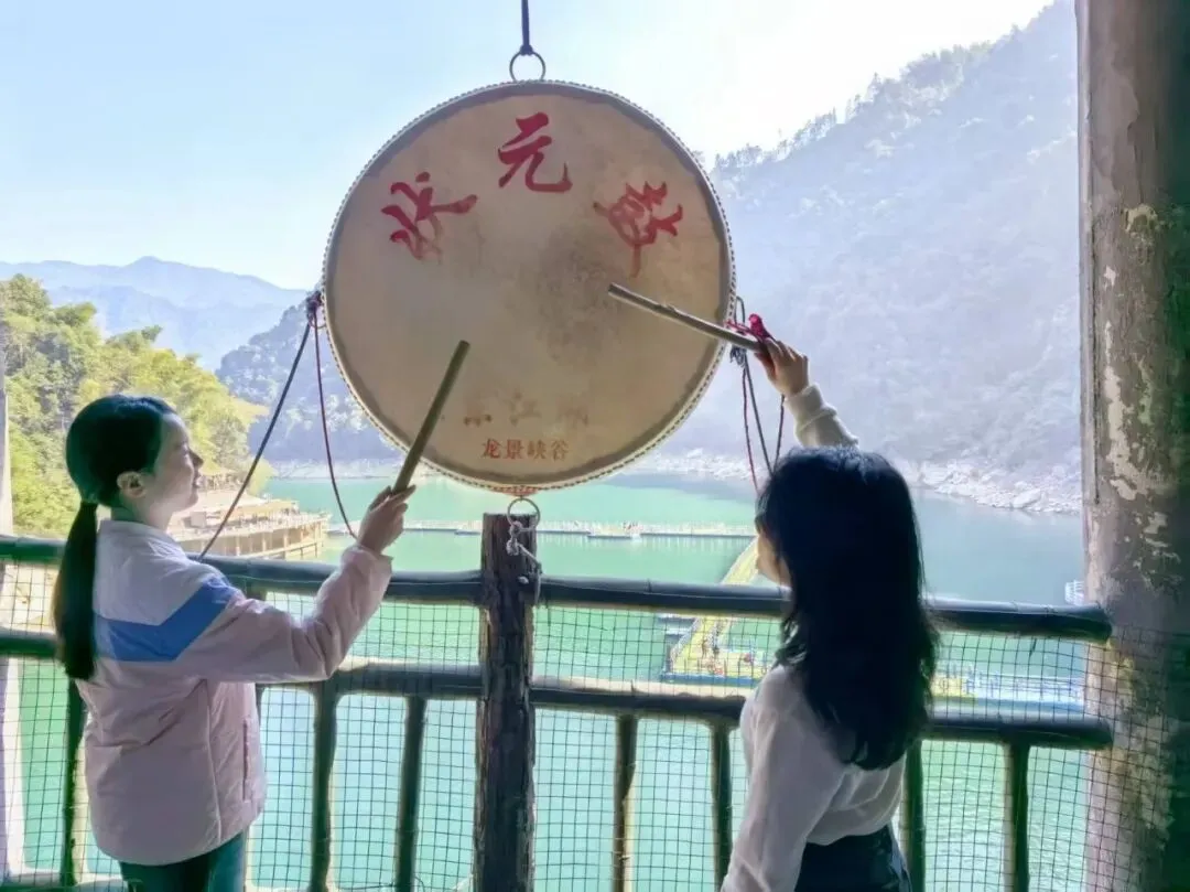 时间有限,我们没有选择长线徒步与溶洞游船,而是走了一段小环道爬山,沿途瀑布错落,小景别致。妻子带着墩妹去敲响状元鼓,鼓声清脆,是对孩子继续进步的小小期许。