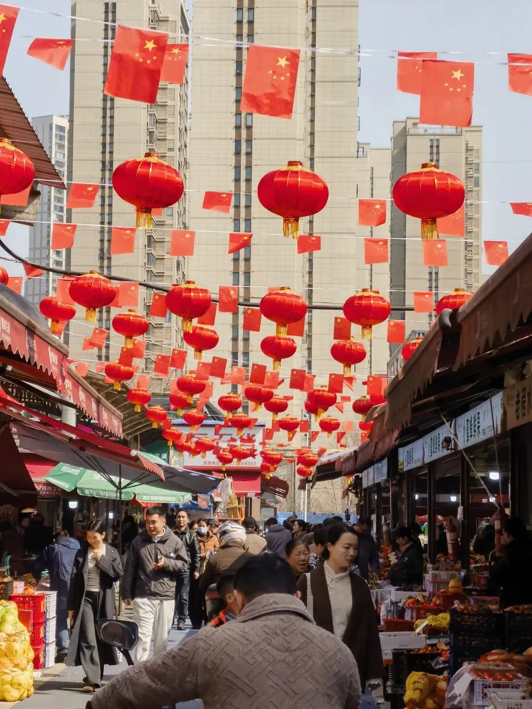 快过年了,早市真的格外热闹,红彤彤的灯笼挂满,人来人往特别有年味。