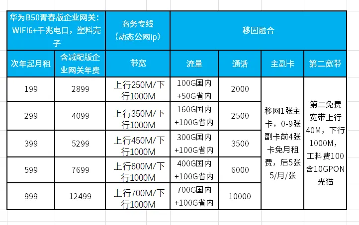 长沙联通企业宽带融合套餐:篇幅有限,介绍家庭套餐为主的帖子,只简单说一下最热门的动态公网ip的商务专线,可含固话。(这是其中一个版本,另一个版本是省内流量变定向,二宽上行50M).企业宽带的核心是,TCP会话数更高。像抖音看直播占用200会话数,王者荣耀占用100.所以家宽只够20个人同时王者荣耀。企业宽带则最便宜的都够160个人同时王者荣耀。还有上传速度,公网IP的区别。 基本构成:基础企业套餐:199-999 + 企业网关499减配版,799高配版。如:199智赋万企,一年约2400.减配版企业网关499,加起来就是2899.第二年因为没有这个费用,所以后续一直2400一年。THE COLD CURRENT WILL ARRIVE 由于新规门槛。在这里发布和宽带,手机有关的都需要授权这个渠道标识。但是公司又不能给个人这个二维码。区分公司的也不能给我个人用。不然说错了会担责,所以得注册代理商。但是实际运营人是政企客户经理,不是代理商。