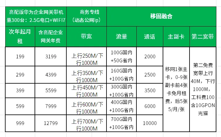 以下内容有时效性。市场环境经常变化。不能你准备今年年底办的,结果现在一问,年底却早就变了好几版了。这是1000M宽带的测速(网线连接2.5G网口,或者万兆光猫自带WIFI或者中兴FTTR的测速)。典型套餐为:长沙联通极低套餐升级到79/89(阶段性活动)等三年协议含FTTR免设备和安装费等套餐。还有新用户139七折套餐。这是2000M宽带的客户发我的测速(网线连接中兴FTTR2.5G网口实测)。典型套餐为:新用户199七折套餐和老用户199送手机的套餐。高套餐有更高的上传和下载速度。注意,它们由于TCP会话数,和没有ipv4公网ip等原因,依旧不能代替企业宽带。 找我们办业务有啥优势?我们把所有套餐内容和细节都写出来了,不会见菜下碟。有文字记录和先装机后付费。以及大部分业务其实我们都得上门面对面办理。加之我们只是业务员,实际安装和维护都是片区装机师傅,不存在售后难的问题。以及多年的经验客户反馈,知道哪些设备好与不好,为您的网络稳定保驾护航。业务办理是一时的,但是服务永无止境。我们希望的是徙木立信和源头活水。 长沙联通480一年300M,工料费100含光猫.第二年续按480或者跟着后续政策变低。 长沙联通1479第一年1000M单宽带,已包含工料费,含中兴FTTR1主1从全屋WIFI。FTTR用到坏为止,三年维保。2.5G网口,不浪费每一分钱的性能。续费按480/年,由于这里的核心是加了办理FTTR全屋WIFI附带的长期有效1000M提速包。所以续也是保留1000M.FTTR好,还是AC+AP好?我觉得你也不能全听别人的。就像我们听到一些直播的事:比如某厂家的路由器,线上跟线下渠道的机器完全不同型号,让你没法对比,而弱电师傅就喜欢这个牌子避免网上比价你说他坑。而中兴FTTR是一个明确标价的东西并附带3年联通维保。况且还有比光传输更快的方案吗?可替换开发商老旧的网线,拔不动替换不了的,网线连接也可以用(没那么快)。机器和网都是联通的,避免出了问题踢皮球和买家秀与卖家秀的问题。 480一年300M,100光猫代管。720一年500M,100光猫代管。1000M1200一年,100光猫代管。THE COLD CURRENT WILL ARRIVE1,新办卡500M宽带:999一年(折合83.25/月)。管109套餐一整年:70G+500M宽带+650分钟通话+2张免费副卡(10G/100分钟通话额外附带二选一,用完共享主套餐)+最低199工料费含10GPON光猫+WIFI6路由器。加机顶盒(免收视费)+100.需要加摄像头(免7天回看云服务)。(企业用户用包年的多一些,但是家庭客户又不是不能办,也不用担心一次太多,先装确认无误后付的。)2,长沙归属地的腾讯大王卡老号码,可以办理20/月500M宽带,办理条件:预存300分30个月返,含光猫和WIFI6路由器,免安装和设备费。3,长沙联通未装宽带的联通老号码,提档20-30送300-500M宽带,提档20的(且不能低于长沙联通最低送宽带的套餐标准),额外20G流量+1台10GPON光猫,根据原来月消费提档30(且不能低于长沙联通最低送宽带的套餐标准)额外给基础套餐以外的30G流量+1台10GPON光猫+1台WIFI6路由器。老用户送设备的活动附带3年合约。自购设备则不带合约。4,新办卡1000M宽带:139七折(长期有效),实收97.3/月:90G国内流量+1000语音+2个免费副卡(附带10G流量/张),用完共享.200工料费含1光猫1机顶盒(不要机顶盒可以换摄像头)。由于实测和通知都没有违约金,我们说没有合约也没有错。但是退网要退还光猫和机顶盒。(本业务通过公司活动买5G手机享套餐折扣,手机串码我们自己想办法。并叠加官方套餐以外的集团业务额外30G+500语音)FTTR一定是中兴FTTR吗?公司集采了中兴FTTR和某为FTTR,但是因为中兴FTTR的2.5G网口在主网关,可玩性更高,而大量用户反馈确实中兴FTTR反馈好一些。近似的集采价里,中兴给的配置还是舍得给配置一些,以及没有出现过某为FTTR那种电源大量刚过保就坏了的事。所以我们录的订单备注含中兴FTTR上门。5:199七折(长期有效)。也就是实收139.3/月。220G国内流量+1500语音+4张免费副卡,每个副卡额外0.01/月获取10G国内流量/100语音二选一。用完共享主套餐的。也就是整套260G+1500语音+下行2000M宽带,上行100+(长期有效)IPTV增强服务芒果至尊会员+含付费频道。299工料费含中兴FTTR1主1从1机顶盒。FTTR组成“聪明”的WIFI,走到这边自动切这边走到那边自动切那边的WIFI无缝漫游。6:长沙未装宽带的老用户:根据原来月消费提档40(不能低于长沙联通最低送宽带的套餐标准),额外给基础套餐以外的40G流量+1000M宽带+中兴FTTR1主1从+机顶盒。(老用户方案,原来套餐很低的,可以几十/月就可以含FTTR。)。老用户送设备的活动附带3年合约。直接工料费的设备则不带。