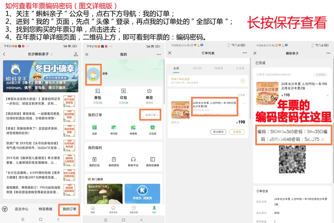【找到卡密】关注“长沙蝌蚪亲子”公众号,进“我的订单-全部订单”查看年票订单并点开,10位数的电子编码和6位数的密码即是年票的卡密。