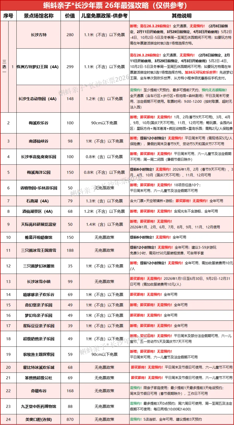 温馨提示:长沙方特、株洲方特、生态动物园为三选一场馆,3个任选1个游玩。如玩方特,需在2026.03.29前激活绑定年票。方特春节可用,2月8日前绑定,11日开始使用,3月29日前绑定,4月3日开始使用。