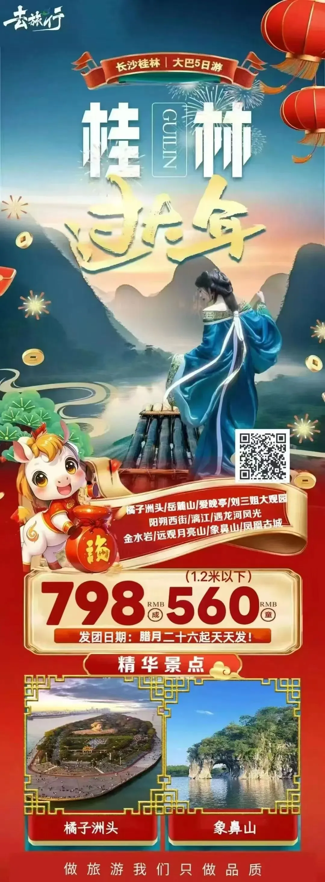 长沙橘子洲头/桂林榕杉湖/日月双塔/象鼻山/刘三姐大观园/阳朔西街/徒步遇龙河