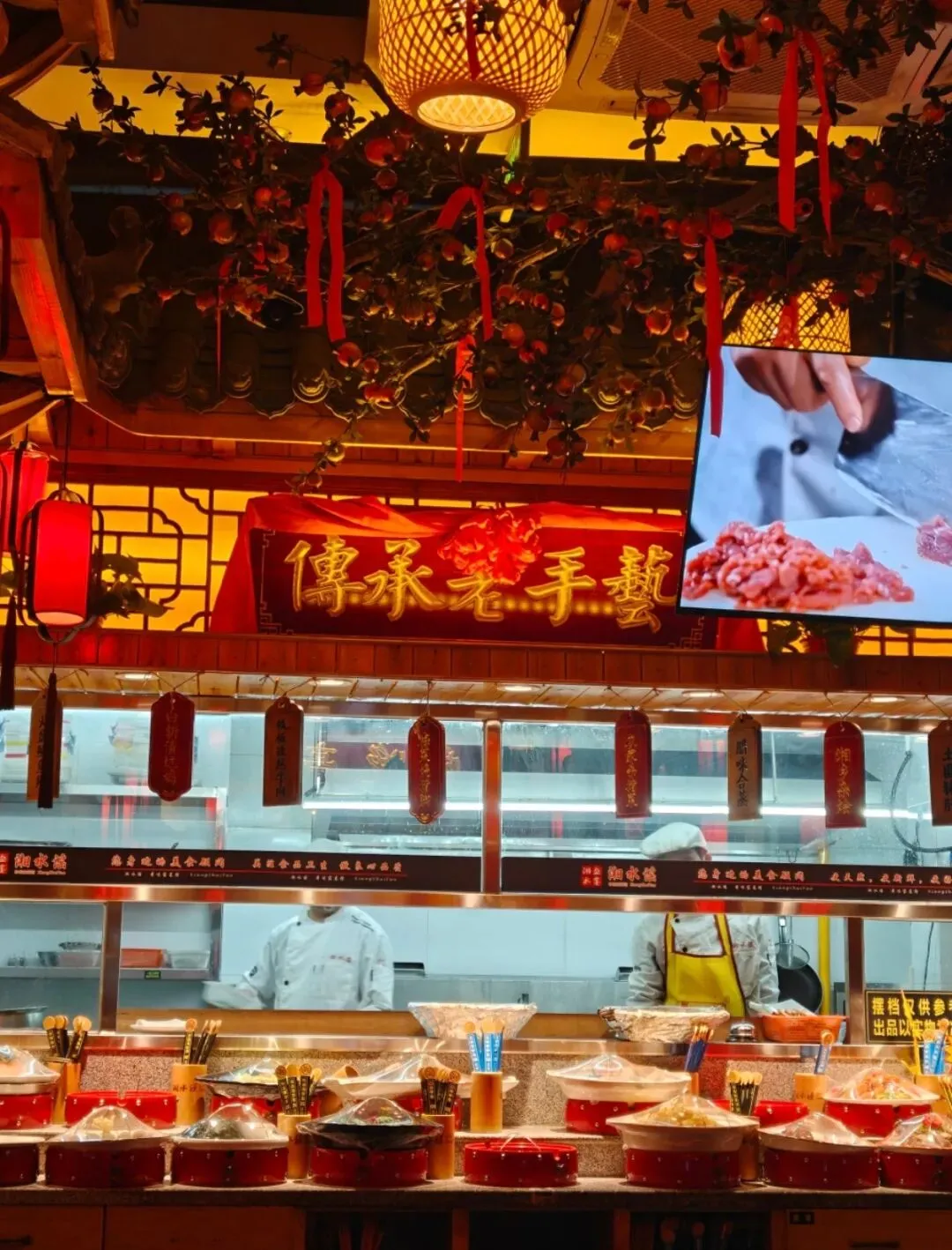“湘水谣”主打复古民族喜庆中国风,从门头到内部装饰都充满传统韵味。门口悬挂着红灯笼,门楣上“湘水谣”三个大字醒目,内部有仿古木结构、石榴树造型与红色祈福带,营造出浓厚的节日氛围。餐厅分为上下两层,楼下是大厅,楼上是包厢,中式庭院风的装修很受长辈们的喜欢,适合家庭聚餐或朋友小聚。