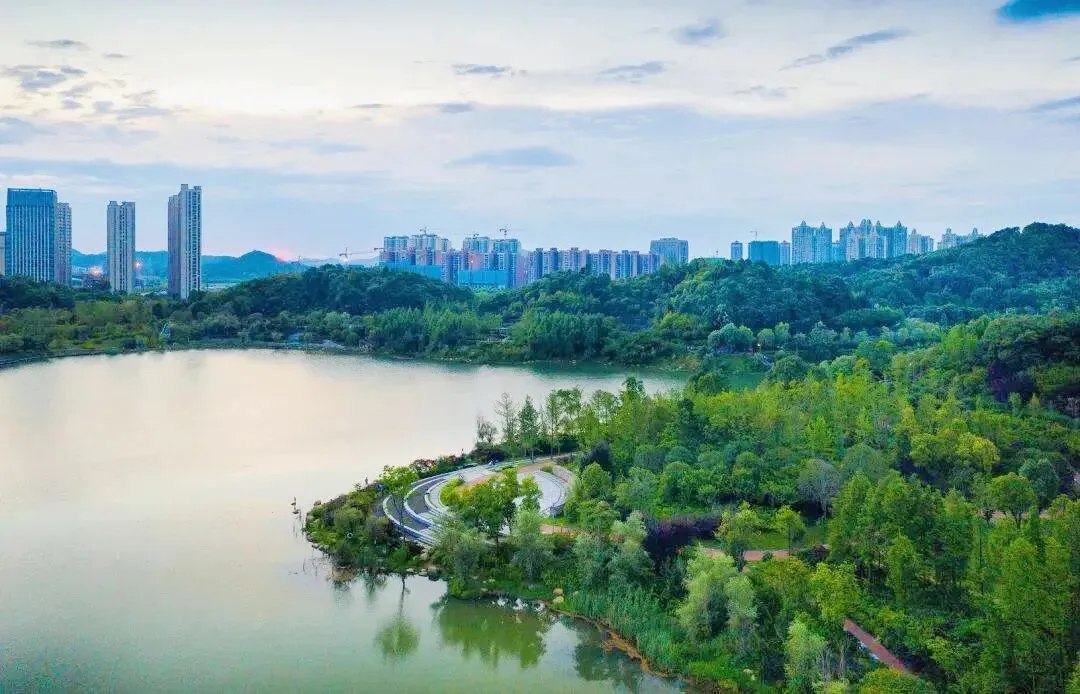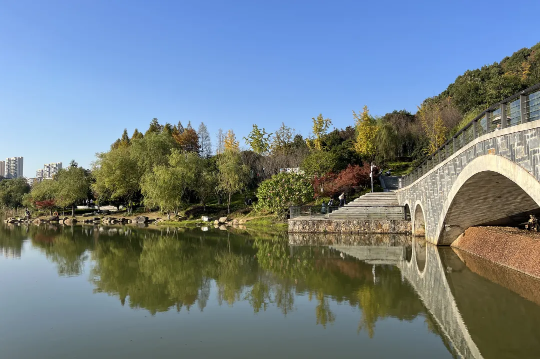 在这里,可以春赏百花齐放、夏闻栀子花香、秋望漫山红枫、冬看常绿香樟;可以约三五好友在湖边闲庭信步,感受微风拂面的温柔;可以轻松通过人行栈道,爬上山顶,俯瞰整个生机勃勃的新区,是市民休闲健身的好去处。