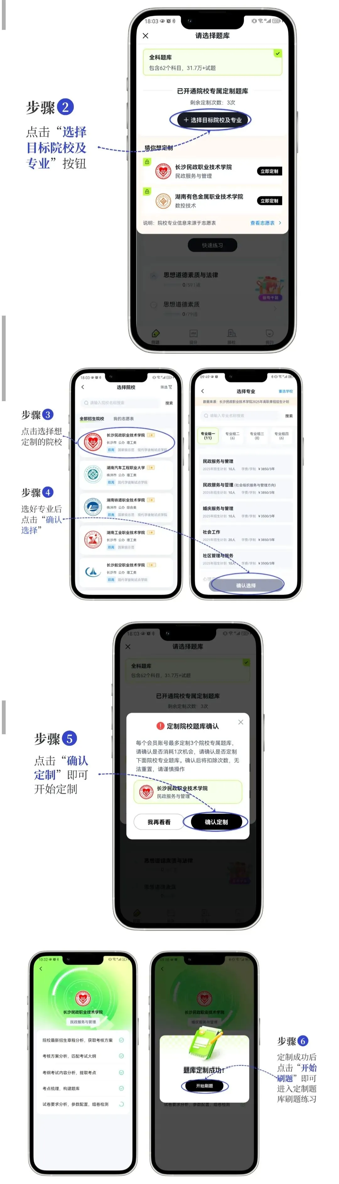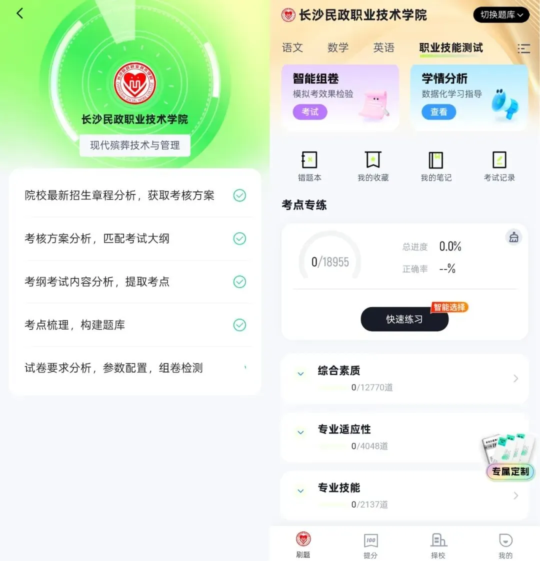 -定制题库:针对“考纲差异大”的痛点,直接对标各校考点——比如长沙民政的技术类题目、长沙航空的综合素养题,刷题不用再乱找资料