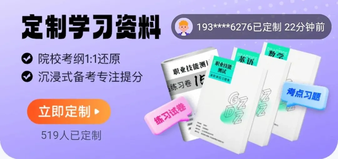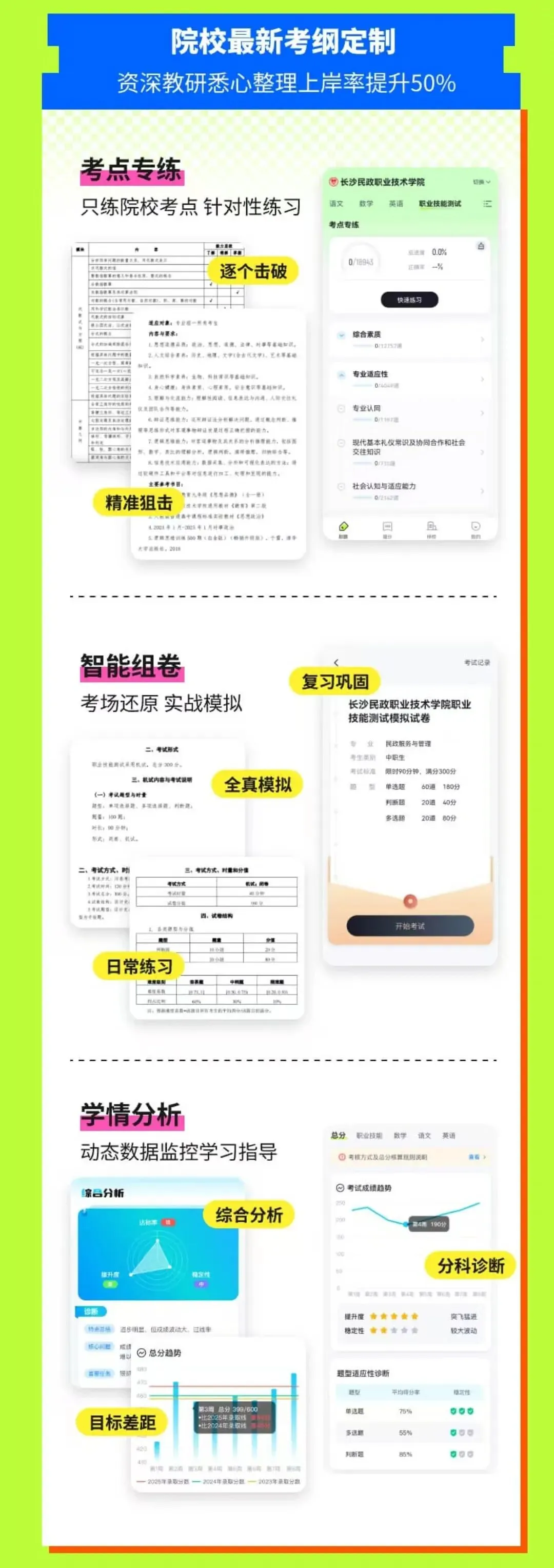 -精准提分:① 考点专练:针对院校单招考纲拆解专项训练,薄弱点精准突破; ② 智能组卷:全真模拟测试还原考场; ③ 学情分析:动态数据监控学习指导