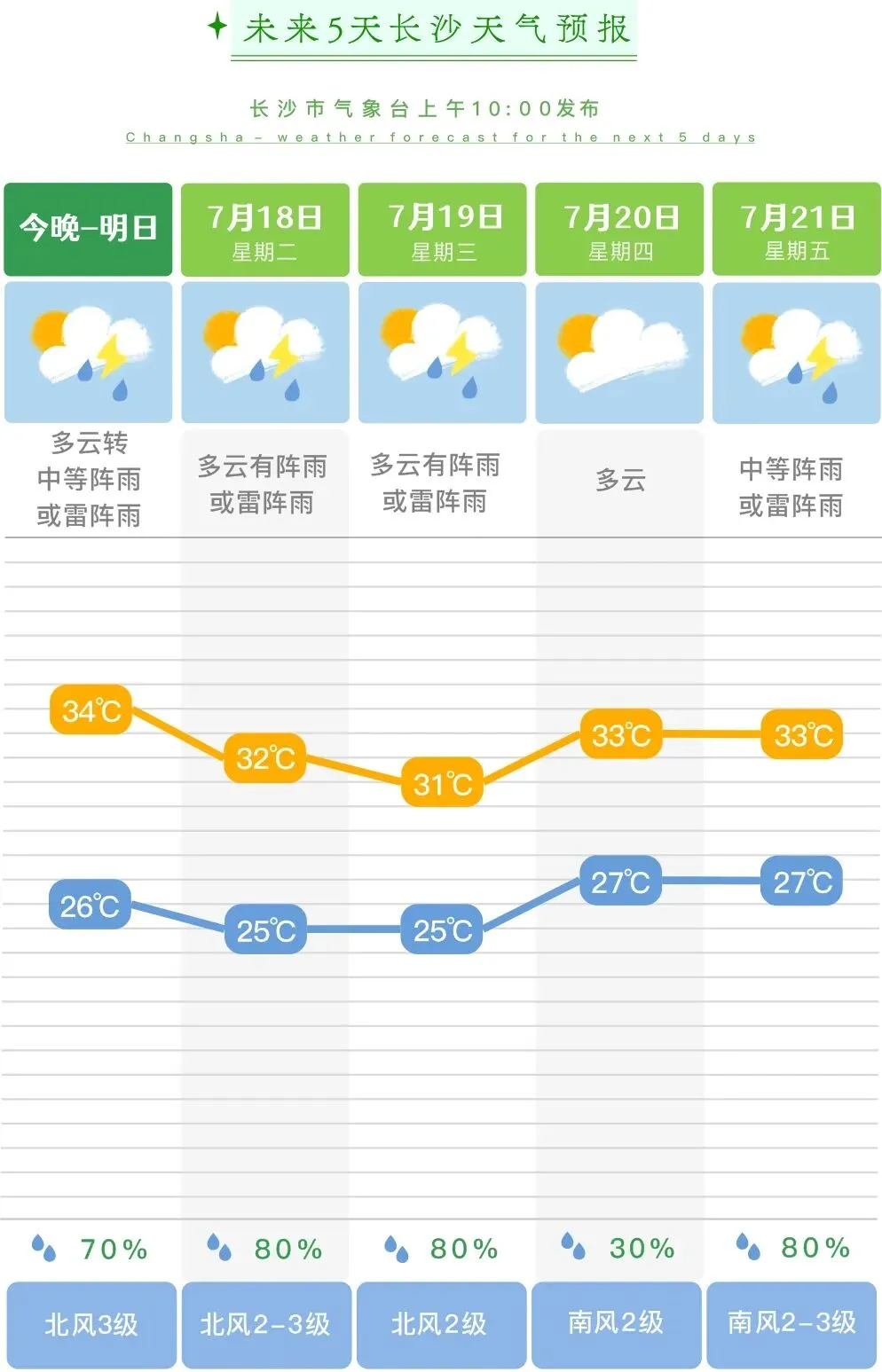 岳阳东部、长沙、湘潭、株洲、衡阳、娄底、邵阳东部、永州、郴州多云有小到中等阵雨或雷阵雨,其中郴州南部、永州南部局地大到暴雨,其他地区晴天到多云;北风3~4级,雷雨时局地阵风6~7级;最高气温湘南30~32℃,其他地区32~34℃;最低气温湘西21~23℃,其他地区24~26℃。
