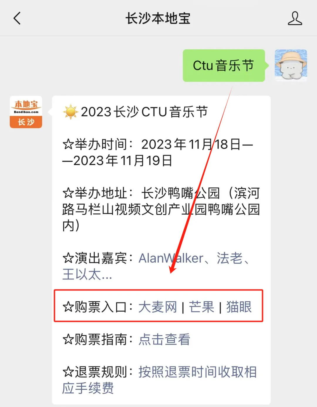 关注【长沙本地宝】微信公众号,聊天框回复【CTU音乐节】即可点击进入官方指定购票入口~